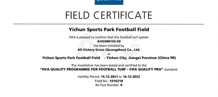 (AVG) Vào ngày 16/12 vừa qua, sau khi trải qua quá trình nghiệm thu nghiêm ngặt của phòng thí nghiệm LaboSport Pháp do FIFA chỉ định, sân bóng đá tại công viên thể thao Yichun (Trung Quốc) trải cỏ AVG đã xuất sắc vượt qua kỳ kiểm tra chất lượng cỏ nhân tạo của FIFA và đạt chứng nhận FIFA Quality Pro.
